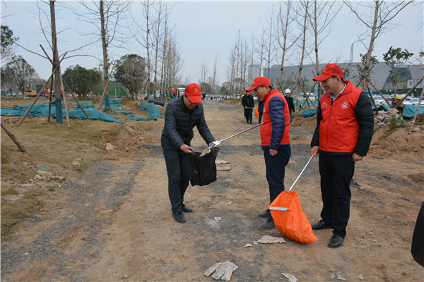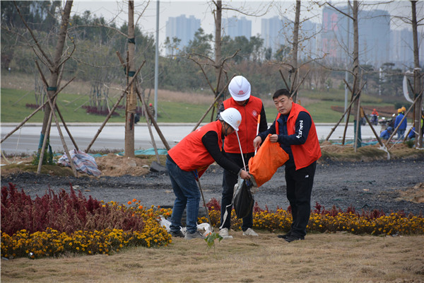 上午十时三十分,志愿服务活动开始后,yl23455永利集团官网党委委员、副总经理、项目部总经理汪洋亲自带头参加活动,其他党员干部带头干,职工群众积极干,参建单位负责人志愿加入干,大家拿起工具、弯下腰去,捡起草地上的生活垃圾,集中放进现场放置的垃圾桶内;没有拿到工具的同志们也拿起简易垃圾袋,将捡到的生活垃圾放进垃圾袋盛满后再放进垃圾桶内。一时间,党徽熠熠、爱心闪闪、干劲满满,不到一个小时时间,约20人的志愿服务队伍完成了近20000平米区域的垃圾清理任务,景观施工现场面貌大为改观。